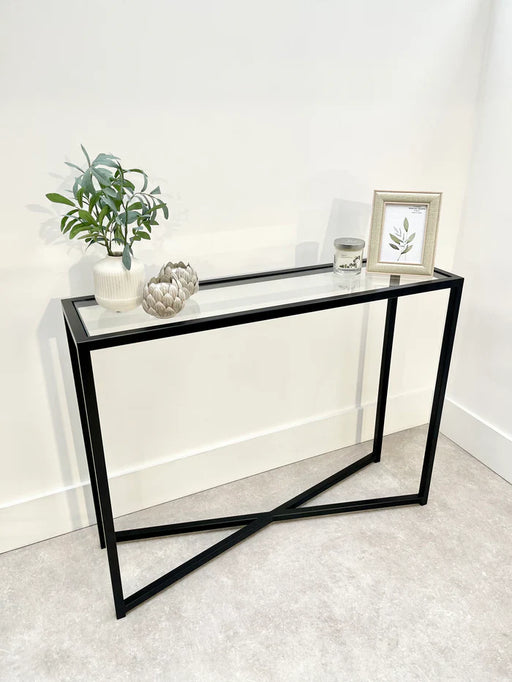 The Hudson Console Table pairs a black steel frame with a clear glass top and shelf, creating a sleek, layered silhouette. Ideal for hallways or li...