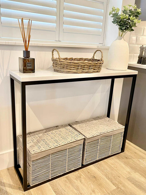 With a hand-crafted matte black metal frame and a thick piece of Carrara marble, our console table makes a real statement piece in any living are...