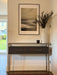 The Harrington console table features a dual drawer set inside of a minimal medium bronze metal frame. The glass top sits neatly within the frame - the perfect place for your favourite lamp and accessories.